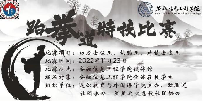 为让同学们在强健体魄的同时刺激大脑发育,提高自身精力,由通识教育与外国语学院主办,安徽信息工程跆拳道协会承办,星星之火急救社协办的第一届跆拳道特技比赛于11月23日在体育馆三楼成功举办。比赛分为功力击破王、快腿王、特技击破王三个项目,参赛选手可任选其一参加,来自全校二百多名学生参与比赛。 (图为活动海报) (图为现场工作人员合照) (图为活动志愿者合照)比赛当天,工作人员指导选手进行了充分的热身,以避免比赛过程中选手由于热身不当造成的损伤,不仅如此,每个赛场都配备医疗小组,随时准备应对各种可能的突发情况。主办方准备充分,选手们也拼尽全力,“功力击破王”赛场,选手们手起瓦落,动作干脆果断;“快腿王”赛场,选手们转胯发力,出腿稳准狠,脚靶的击打声不绝于耳;“特技击破王”赛场,选手们前踢、横踢变化不断,木板应声而破,为同学们带来了一场精彩绝伦的视觉盛宴。 (比赛现场)(图为现场工作人员)在本次比赛中,选手们赛出了风格,赛出了水平,展示出了跆拳道“礼义廉耻 忍耐克己 百折不屈”的精神;裁判员严
