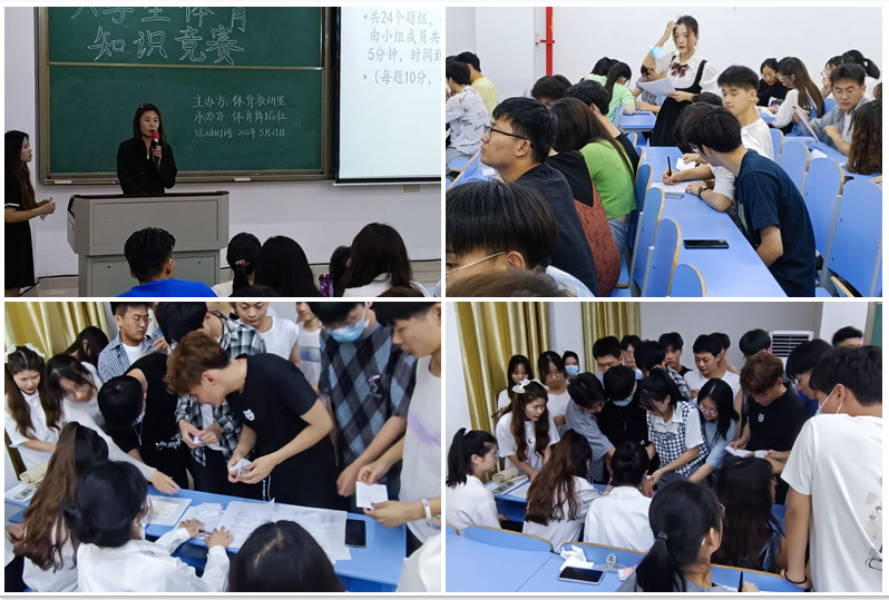 为丰富大学生的校园文化生活,引导大学生关注社会,拓展知识面,充实和激励自我,增强团队的合作精神,我校体育舞蹈社于2022年5月26日晚7:30,于A3博学楼W102举办了“体育知识竞赛”活动。活动伊始,参赛者们怀着激动的心情在场有序签到,各部门负责人及活动志愿者也积极维护现场秩序,促使活动有序进行。在活动进行中,各队伍人员积极配合,参赛人员运用充实的体育知识储备积极思考,各参赛队伍亳不示弱,争相抢答,一直在比分上缩小和领先队伍的差距,场上气氛十分紧张。最后的几道题时,各个小组更是把握住最后的反超机会,慎重抢答。最后,活动以第三环节——你画我猜圆满结束,在此起彼伏的掌声下,本次比赛圆满落幕,最后的欢呼声为此次活动画上了完美的句号。通过本次活动,参赛人员不仅加深了对体育知识的了解,还提高了团队合作能力。此次活动积极跟进国家对德智体美劳大学生政策,还丰富了大学生的在校生活。相信经过本次活动,同学们可以充实和激励自我,更加积极的参与到体育活动中去。活动现场